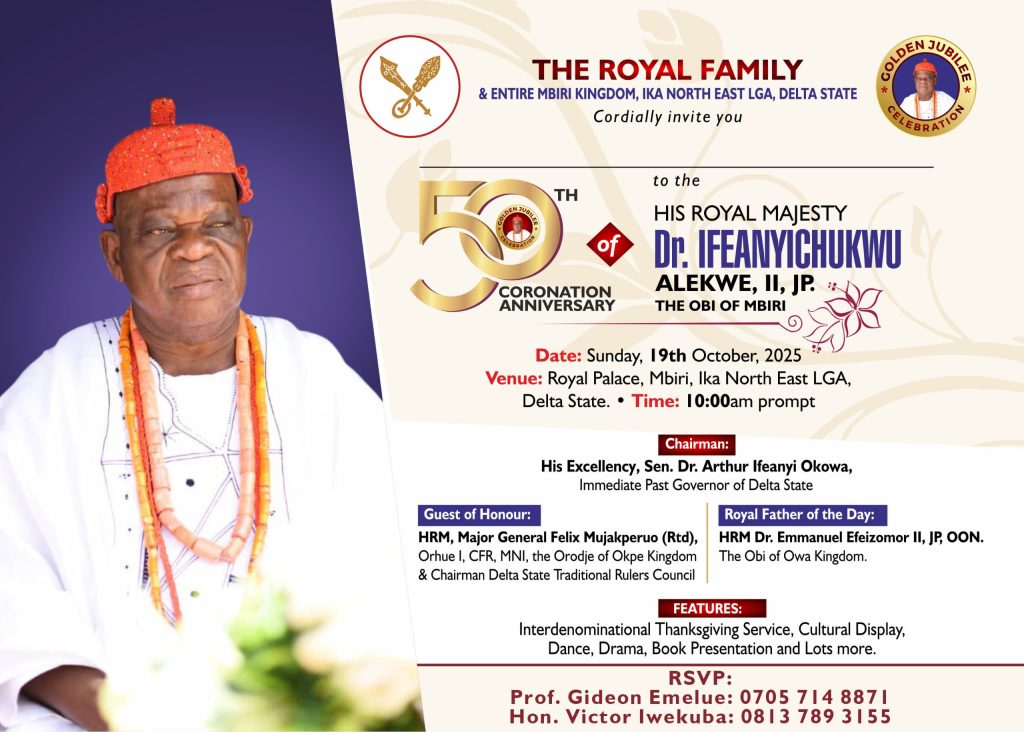 “The celebration, which will climax on Sunday, October 19, 2025, at the Royal Palace of Mbiri Kingdom in Ika North East Local Government Area of Delta State, promises to be an unforgettable experience”.