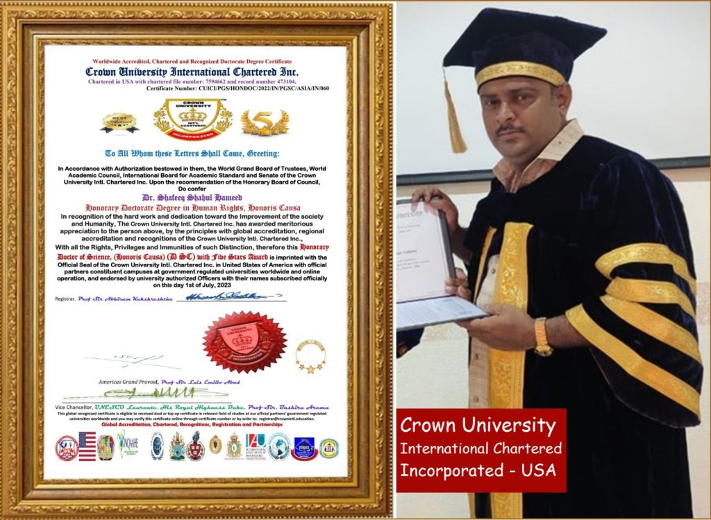 The statement by CUICI VC, World Acclaimed Distinguished Universities Research Professor of Computer Science, Information Communication Technology reads in parts: “As the Vice-Chancellor of Crown University International Chartered Inc CUICI, USA, I, Prof Sir Bashiru Aremu use this medium commend Dr. Shafeeq Shahul Hameed for his learnings, contributions to global civic space, sustainable global Human rights development & Activism. The academic feats he has attained, experiences acquired over the years in the Civic space and other economic sectors. Dr.Shafeeq Shahul Hameed has been endorsed by me, bags Honorary Doctorate Degrees in “Human Rights” from our global research University, Crown University Int’l Chartered Incorporated, United States of America (USA). He is a Renowned Indian Human Rights Activist And